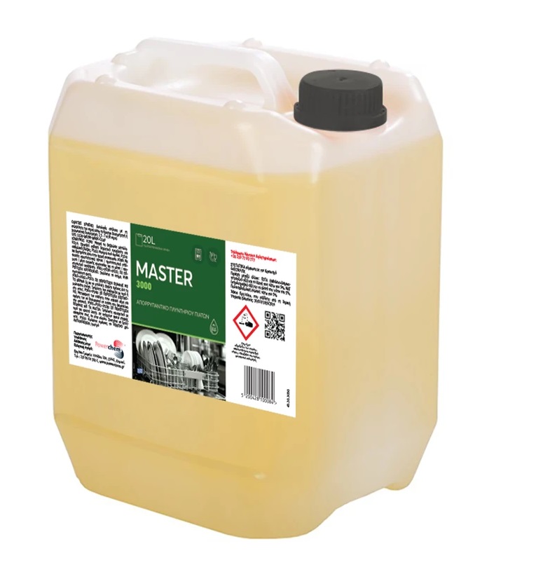 Συμπυκνωμένο απορρυπαντικό πλυντηρίου πιάτων / ποτηριών Master 30000 20L, εξαιρετικά αποτελεσματικό για συνθήκες πλύσης με μέτρια σκληρότητα νερού.