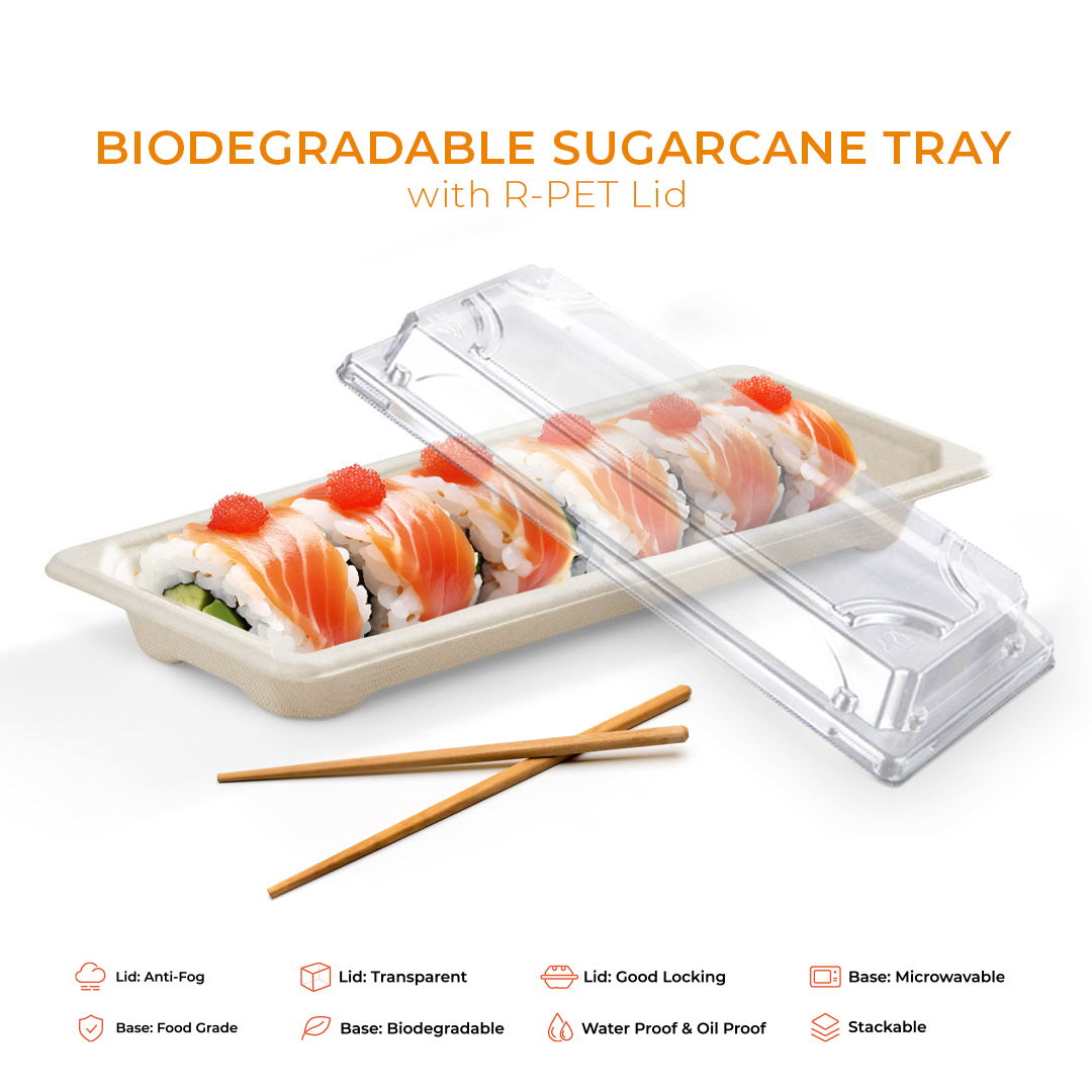 Σκεύος φαγητού από ζαχαροκάλαμο σε εκλεπτυσμένο μπεζ χρώμα, συνοδευόμενο από διάφανο καπάκι από RPET. Αυτό το σετ είναι ιδανικό για σερβίρισμα sushi αλλά και μικρών μερίδων, ορεκτικών, και άλλων λιχουδιών.
