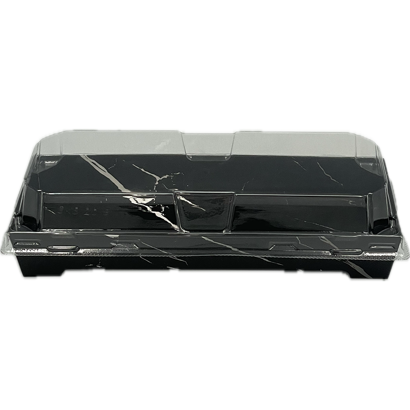 Σκεύος φαγητού Sushi premium σε μαύρο χρώμα με τύπωμα μαρμάρου, συνοδευόμενο από διάφανο καπάκι. Αυτό το σετ είναι ιδανικό για σερβίρισμα sushi αλλά και μικρών μερίδων, ορεκτικών, και άλλων λιχουδιών.