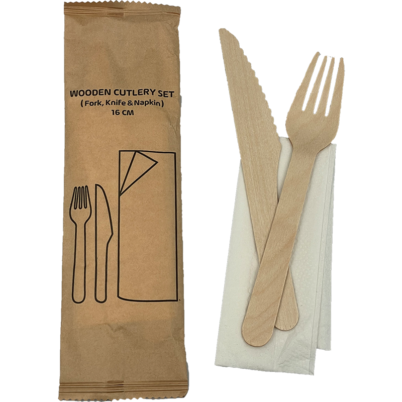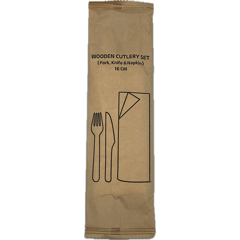 Ο φάκελος περιέχει ξύλινο μαχαίρι φαγητού 16cm, ξύλινο πιρούνι φαγητού 16cm & λευκή χαρτοπετσέτα δίφυλλη).