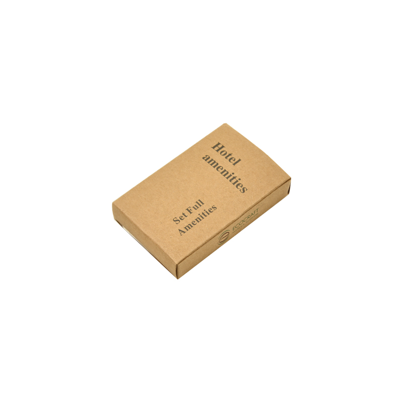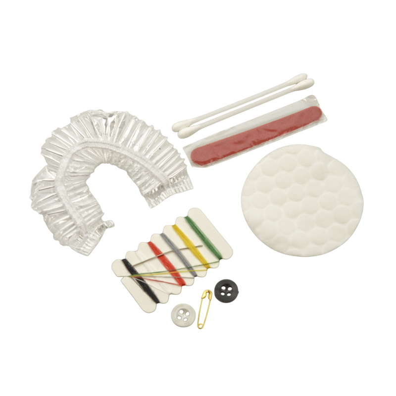 The set cosists of sewing kit, shower cap, make up remover cotton, 2 q-tips and 1 nail file, in a recyclable kraft packaging.