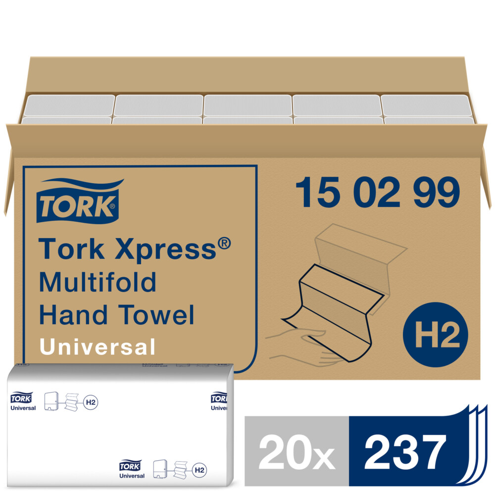 Χειροπετσέτα λευκή 2φυλλη Universal Tork Xpress® Multifold σε επαγγελματική συσκευασία κιβωτίου.
